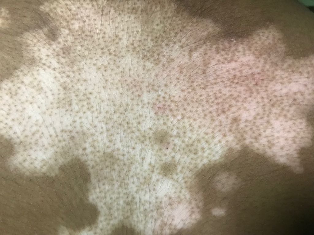 Vitiligo or Leukoderma as it is often known is characterized by white patches all over the body and scalp. It is caused by loss of melanin pigments (melanocytes) that is responsible for the skin colour. It usually begins in the form of a small white patch but over a period of time may spread to the entire body. Though it is a non-infectious disease it is associated with lot of social stigma and may have a psychological impact.